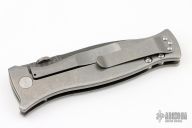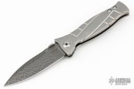 This MK3 by Les George features a Damascus blade with false top edge and knurled thumbdisc. The handle has a stonewashed titanium frame with Sweep pattern and a titanium tip up clip. Nice detent, lockup and blade seating. Comes with a zippered case. New condition.