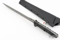 This Stout Spear by Kiku Matsuda features an acid etched blade with false top edge with notched thumbrest, .255" blade thickness and 1.410" blade depth, full tang construction. The handle has black G-10 scales. Comes with kydex sheath and original tag. New condition.