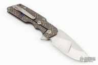 This Custom Mark 1 Flipper by A2D Mercantile features a duplex grind, satin finish blade with flipper. The handle has an orange peel finished and milled titanium frame with titanium tip up clip. Nice detent, lockup and blade seating. Comes with a zipper case. Has some scuffs and scratches on the blade and clip, a little marring on the hardware. Great user condition.