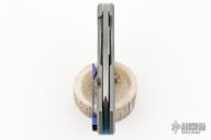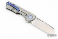 This Production Yeager by Brian Brown features a wharncliffe style blade with belt satin finish. The handle has a milled, bead blast finished titanium frame with anodized Ti pivot collars, Timascus tip up clip and backspacer. Comes with original zipper case, titanium pocket clip, another set of bearings, COA and maker's card. Excellent condition.