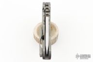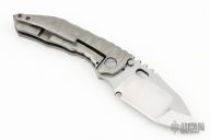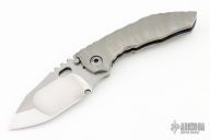 This Draco from Dalibor Bergam features a satin finished blade with notched thumbrest and thumbhole. The handle is has a sculpted, bead blast finished, textured titanium frame with a matching pocket clip positioned for tip up carry. Damasteel pivot. The blade is centered when closed, opens/closes smoothly, and locks up with absolutely no play.  Comes with a zippered case.  Excellent condition.