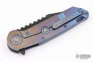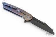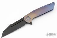 This Warhound flipper by Marfione Custom Knives features a wharncliffe shaped, two tone apocalyptic blade with fullers and flipper. The handle has an Blue Fade Eggshell Finish Titanium with matching tip up clip, anodized titanium backspacer with lanyard hole, anodized titanium hardware, stainless steel pivot, lockface insert and overtravel stop screw. Rides on bearings, nice detent, lockup and blade seating. Comes with original box, zippered case and certificate of authenticity signed/dated 04/2018. S/N #003. Excellent condition with no signs of use or carry.