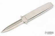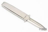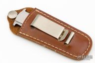 This is a 1980's vintage swing blade in stainless steel. Interesting design where the knife handle folds twice for compact size when closed. Unsharpened edges. Has a couple light scratches, otherwise excellent condition. Comes with a brown leather sheath.