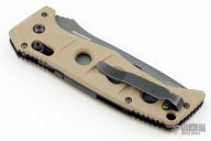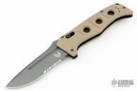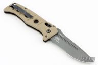 This Adamas by Benchmade is a Shane Sibert design, it has a black partially serrated blade with dual thumbstuds, fullers and notched thumbrest. The handle has FDE G-10 scales, black stainless steel liners and tip up clip. Nice lockup and blade seating. Comes with original sheath. Excellent condition.