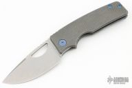 This knife by the OZ Machine Company features a tumbled Magnacut blade with thumbhole and notched thumbrest. The handle features a golf putter milled and tumble finish titanium frame with an anodized titanium backspacer and tip up clip with hidden screws. Includes box and papers dated 2-10-23 and s/n 1374.