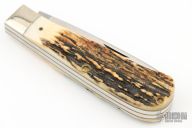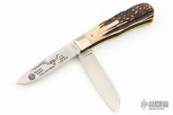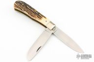 This A05 Slipjoint by Alcas features satin finished blades with nail nicks. The handle has nickel silver bolsters, stag scales, brass liners and stainless steel springs. Excellent condition. #005 of 217.