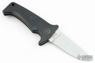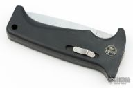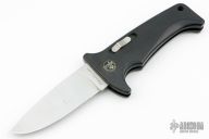 This Rare (pre Fiskars buyout) Gerber Parabellum has a satin finished drop point stainless steel blade. Handle is black polymer with black fiber backspacer and thumb axis-lock button. Lanyard hole. This is an (circa) early 90s creation. Has soem light scratches and a couple small spots on the blade, otherwise good condition.