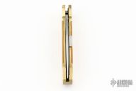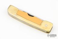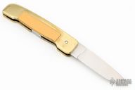This knife by Basic Tools features a satin finished blade with nail nick. The handle has a brass frame with yellow paper micarta inlays. Has a steel tab to unlock the knife. Has some light scratches, otherwise good condition.