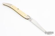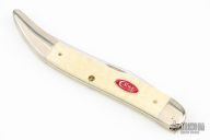 This Toothpick by Case Knives features mirror finished blade with nail nick. The handle has nickel silver bolsters, white jigged bone covers, brass liners, and a stainless spring. Has some light scratches, otherwise good condition.