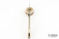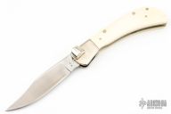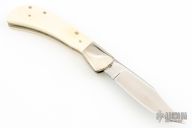 This knife by Jerry Stone features a satin finished blade. The handle has nickel silver dovetailed bolsters, mammoth ivory covers, nickel silver liners and a fileworked stainless steel backspacer. Has a few light scratches, otherwise excellent condition.
