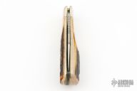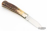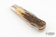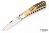 This Ka-Bar slipjoint has a mirror polished blade with nail nick. The handle has nickel silver bolsters, stag scales, brass liners, and stainless steel spring. Excellent condition. #2770