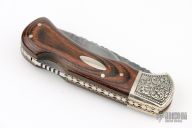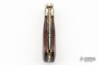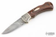 This lockback by Deer Field features a San Mai Damascus blade with fileworked spine. The handle has engraved nickel silver bolsters, dymondwood scales, brass liners and fileworked stainless steel backspacer. Has some light scratches, otherwise good condition.