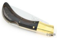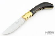 This Lockback by Bill King features a satin finished blade. The handle has brass bolsters, buffalo horn scales, brass liners and steel lockbar. Has some light scratches, otherwise excellent condition. #081