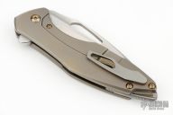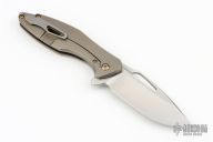 This Arius by Koenig knives features a two-tone blade with thumbhole and flipper. The handle has a nicely milled and anodized titanium frame with a titanium tip up clip, anodized titanium backspacer. Has ceramic bearings and a ceramic detent ball. Nice detent, lockup and blade seating. Gen4B6. Comes with original box, and COA dated July 6 2021. Excellent condition.