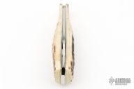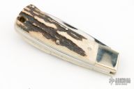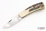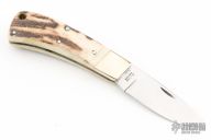 This knife by Bertram was made for Hen and Rooster, it features a mirror finished blade with a nail nick. The handle features nickel silver bolsters and liners, stag scales, steel spring. Has a few light scratches, otherwise excellent condition.
