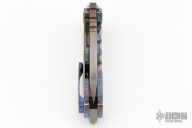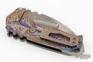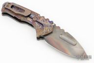 This Praetorian Genesis TI from Medford Knife and Tool features a Vulcan finished drop point blade with fuller, notched thumbrest and dual thumbstuds. The handle is comprised of a flamed titanium frame over a D2 backspacer/glass breaker. Tumble titanium tip up clip. Great blade seating, detent and lock up. Includes original hard case, and COA dated Sep 10 2021. Excellent condition.