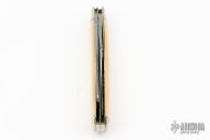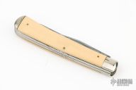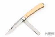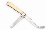This Trapper from Ka-Bar features polished blades with nail nicks. The handle has nickel silver bolsters and pommel with ivory paper micarta scales over nickel silver liners and steel springs. Has some scratches, Has been sharpened, otherwise good condition for its age.