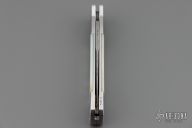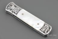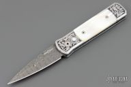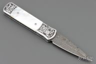 This one of a kind knife features a Damascus blade with a false top edge. The stainless steel handle has been engraved, has mirror polished with mother-of-pearl inlays, and jeweled interior. This is a beautiful knife a work of art and an excellent addition to any collection. Comes with original collector case. Has some gunk on the blade and some oxidation as well. Has a couple light scuffs and dings on the frame. Great condition otherwise.