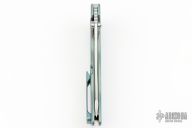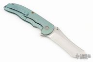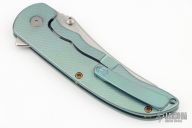 This Norseman (#5074) by John Grimsmo features a stonewashed blade with a single anodized titanium thumb stud, notched thumb ramp and flipper. Stonewash and anodized finished titanium frame with anodized titanium screws. Has a matching clip with hidden screws. Very smooth action that requires no wrist movement. Nice detent, lockup and blade seating. Rides on ceramic bearings. Has some light scuffs, excellent condition otherwise.