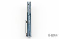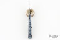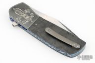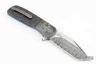 This HB16 Linerlock Flipper by Herucus Blomerus features a Odins Eye Damasteel blade with polished flats and a flipper. The handle has engraved zirconium bolsters, marble carbon fiber scales with anodized titanium liners with fileworked spines, Odins Eye Damasteel backspacer and a tip up milled titanium clip with ceramic ball. Blade is centered when closed, nice detent and lockup. Very smooth flipping action, rides on dual row Ceramic IKBS. Comes with nylon velcro case and COA. Excellent condition. One off.