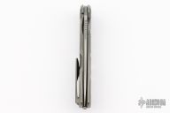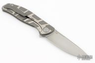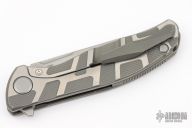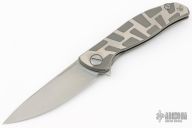 This F95T by Shirogorov Knives features a stonewashed blade with a notched thumbrest and flipper. The handle has a two-tone milled titanium frame with matching titanium backspacer and tip up clip. Nice detent, lockup and blade seating. Has MRBS. Comes with original box and COA. Excellent condition.