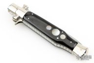 AGA Campolin 11" Blackwidow with Brazil Horn and mother-of-pearl inlays! This Campolin made automatic knife has solid nickel silver bolsters with maltese cross in the hilt. To close this one you use the lock back release at rear of the handle. This makes for very tight and stable construction and it's a bit more robust because of that. Has a mirror polished blade with fileworked spine. The nickel silver liners are fileworked and so is the stainless steel backspacer.   Excellent Condition.