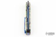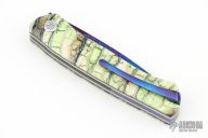 This Frodo by N&L Knives features a Rietveld Blued Nebula Damascus blade with notched thumbrest and front flipper. The handle has mammoth tooth scales and Timascus backspacer with black liners, satin finished stainless steel liners, tip up titanium clip with hidden screws. Rides on bearings, nice detent, lockup and blade seating. Comes with zippered case and COA. Excellent condition.
