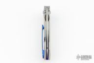 This Drifter flipper from Steven Skiff features a hand rub satin finished blade with flipper. The handle has a milled and bead blast finished titanium frame with zirconium tip up clip, pivot collars and backspacer. Very smooth action on Skiff Bearings with a nice detent, lockup and blade seating. Includes nylon zippered case. Excellent condition.