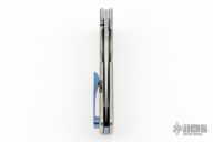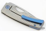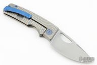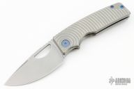 This knife by the OZ Machine Company features a tumbled Magnacut blade with thumbhole and notched thumbrest. The handle features a milled titanium frame with a titanium backspacer and tip up pocket clip with hidden screws. Includes box and papers dated 3-23-23 and s/n 1561. Excellent condition.