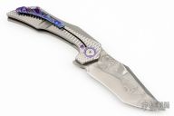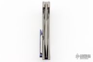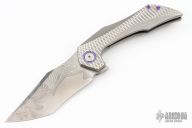 This Omen V2 by Fanatic Edge features a Chad Nichols San Mai Damascus blade with flipper. The handle has a milled and tumbled titanium frame with a ZircuTi tip up clip and backspacer, anodized titanium pivot collars and hardware. Rides on bearings, nice detent, and lockup. Excellent condition. Comes with a original cloth case.