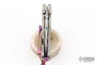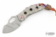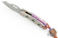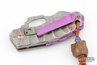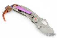 This T-Rex by Zhu Homer features a textured blade with notched thumbrest and a thumbhole. The handle has a textured and tumbled titanium frame, carved and anodized titanium backspacer, carved and anodized tip up titanium clip with hidden screws. Nice detent, lockup and blade seating.  Comes with a copper bead and leather lanyard. Also comes with original box and COA. Excellent condition.