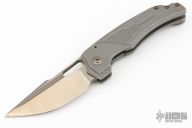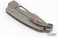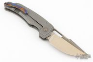 This Tacti Chongo from J.B. Stout features a bronzed D2 blade with thumb hole and notched thumb rest. The handle has a tumbled titanium frame that has been machined with one of Mr. Stout's unique patterns, has a tip up mokuti clip. Blade is centered when closed and locks up with no play. Comes with COA dated 7/25/19. Excellent condition.