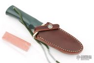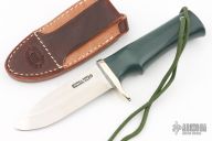 The Fireman Special by Randall is a non-catalog model with an extra-heavy beveled blade with 224" blade stock and 1.172" blade depth. This knife has a 4" stainless steel blade with notched thumbrest, nickel silver guard, and a green G-10 grip, full tang construction. Comes with a brown leather sheath and original paper wrapping. New from maker.