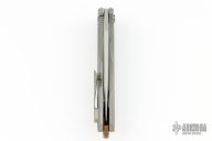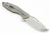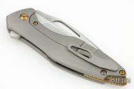 This Arius Flipper by Koenig knives features a two-tone blade with thumbhole and flipper. The handle has a bead blasted and milled titanium frame with anodized titanium backspacer and a bead blasted tip up clip with hidden screws. Has ceramic bearings and a ceramic detent ball. Nice detent, lockup and blade seating. Excellent condition. Comes with original box and COA dated January 13, 2022. Gen4B7