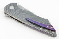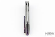 This Vespertilio Flipper by Herman Knives features a tumbled blade with flipper. The handle has a milled titanium frame with inlaid anodized and textured titanium bolster, titanium liner, anodized and textured tip up titanium clip and backspacer. Nice detent, lockup and blade seating. Rides on bearings. Excellent condition. Comes with zippered case and COA dated 3-8-22