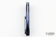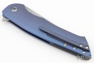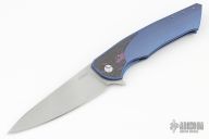 This Slim Flipper by Herman Knives features a tumbled blade with flipper. The handle has a milled and anodized titanium frame with inlaid black/purple carbon fiber bolster, titanium liner, and tip up anodized titanium clip and backspacer. Nice detent, lockup and blade seating. Rides on bearings. Excellent condition. Comes with original zippered case and COA dated 11-9-21.  Excellent Condition.