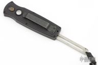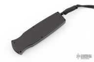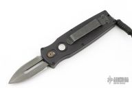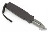 This is a push button single action automatic with double edged spear point blade with black finish. T6 black aluminum handle with hatched pattern milling. Blade is retracted by depressing button and pulling recharge handle in the butt. Slide safety. Excellent condition but does have some scuffs on handle. Serial number 004