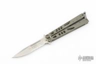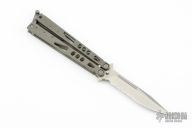 This Tachyon balisong by Microtech has a tumbled partially serrated blade and skeletonized bead blast titanium handles. #0898 and dated 02/2002. Has a couple light scuffs, otherwise excellent condition. Comes with original nylon sheath.