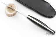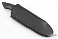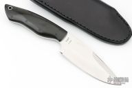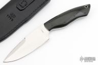 This knife by Mickey Yurco features a mirror finished blade with sharpened top edge, .204" blade thickness and 1.368" blade depth, full tapered tang construction. The handle has black canvas micarta scales with black pins. Comes with a black leather sheath. #1760. Excellent condition. Comes with COA.
