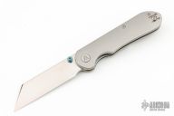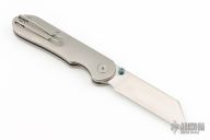 This knife features a satin finished blade with dual thumbstuds. The handle has bead blasted titanium scales over steel liners and a tip up steel pocket clip. Includes the original box. Excellent Condition.