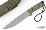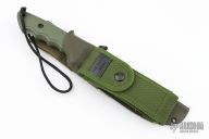 This SOK by Hill Knives Holland features a titanium nitrate coated blade with false top edge, .197" blade stock and 1.467" blade depth, hidden tang construction. The handle is green polycarbonate grip. Comes with a kydex sheath with a removable auxillary nylon pouch with sharpening steel. Excellent condition.