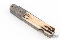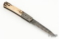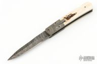 This custom auto by Burn Knives features a twist Damascus spear point blade with false top edge, Damascus bolster, button release, and liners. Blued carbon steel spring and back-spacer. Genuine India sambar stag scales. Lightning quick action. Nice lockup and seating. Very nice piece.  Comes with a zippered case.  Light scratches are visible on the backspring otherwise the knife is in excellent condition.