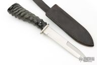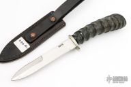 This fighter by Peter Bromley features a satin finished double edged blade with .175" blade depth and .963" blade depth, hidden tang construction. The handle has a nickel silver guard and butt with an impala horn grip. Includes a black leather sheath with belt loop. New from maker.