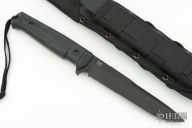 This Alpha from Kizlyar Knives features a black coated drop point blade with swedge, partial serrations and notched thumbrest. The handle is comprised of Kraton/ABS scales over full tang construction with lanyard hole in pommel. Comes with a plastic/nylon sheath. Has some light scuffs, excellent condition otherwise.