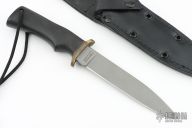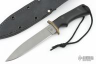 This knife features a bead blasted drop point blade, .178" blade stock and 1.097" blade depth, hidden tang construction. The handle has a bead blasted guard, black micarta handle with lanyard hole. Comes with black leather sheath. Has a couple light scuffs, excellent condition otherwise.