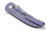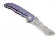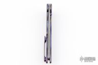 This Norseman (#539) by John Grimsmo features a Damasteel blade with a single anodized titanium thumb stud, notched thumb ramp and flipper. Stonewashed and anodized titanium frame with a honeycomb pattern front scale and titanium screws. Matching tip up pocket clip. Very smooth action that requires no wrist movement. Nice detent, lockup and blade seating. Rides on ceramic bearings. Comes with original box. Dated May 2016 inside the frame. Excellent condition.
