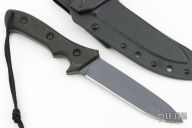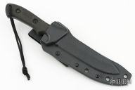 This Strike Fighter by Scar Knives features a black finish drop point blade with notched thumbrest, .184" blade stock and 1.315" blade depth, full tang construction with contoured black G10 scales. Comes with kydex sheath and belt loop. Has some light scuffs, excellent condition.