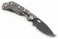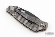 This PT by Mick Strider features a black blade with notched thumbrest and thumbhole. The handle has a Disruptive Strider Stripe finished titanium frame with matching tip up clip. New condition.
