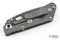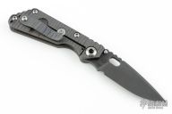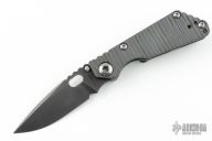 This JVA by Mick Strider is larger than a PT, but smaller than an SNG. It features a black blade with notched thumbrest and thumbhole. The handle has a flame finished titanium frame with matching tip up clip. New condition.