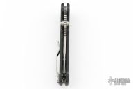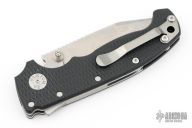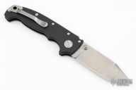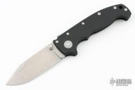 This AD20 by Demko Knives features a stonewashed clip point blade with notched thumbrest and dual thumbstuds.  The handle has a black G-10 frame with a tip up stainless steel clip and "Shark" lock release on the spine. Comes with original box. New condition.